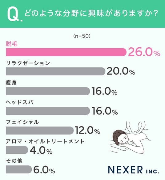 次いで「リラクゼーション」が20.0%、「痩身」と「ヘッドスパ」がそれぞれ16.0%、「フェイシャル」が12.0%という結果になりました。