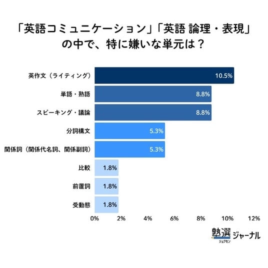 1位の「英語コミュニケーション」と「英語 論理・表現」について、特に嫌いな単元を聞いたところ、文法ではなく「英作文(ライティング)」(10.5%)がトップでした。次いで「単語・熟語」「スピーキング・議論」(各8.8%)という結果になりました。