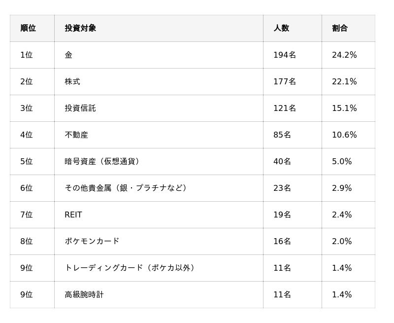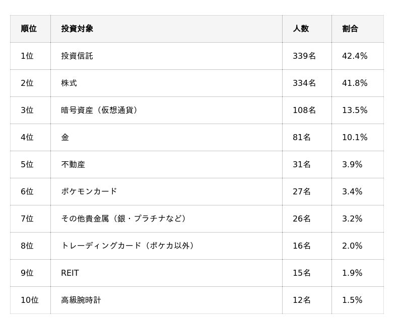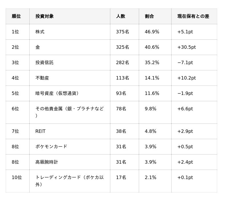 - 3位は「暗号資産(仮想通貨)」(13.5%)で、「金」(10.1%)を上回る