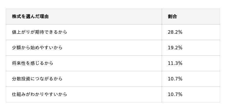 金は「安定資産」「現物としての安心感」が上位で守り志向が強く、株式は「値上がり期待」が1位、投資信託は「少額から始めやすい」が1位でした。