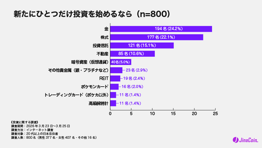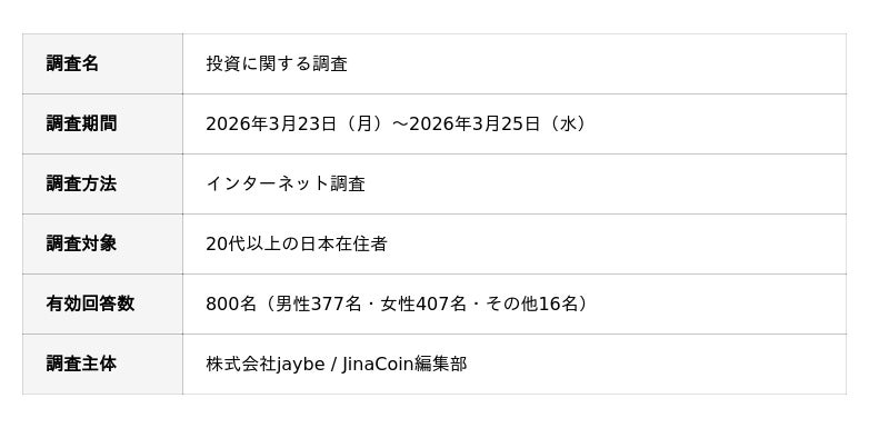 株式会社jaybe(本社:香川県高松市、代表取締役:水澤 誉往)が運営する暗号資産(仮想通貨)ニュースメディア「JinaCoin」(https://jinacoin.ne.jp/)は、20代以上の日本在住者800名を対象に、投資に関するインターネット調査を実施しました。