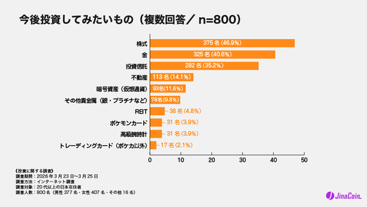 同じ800名に対し、今後保有または投資してみたいものを複数回答で尋ねたところ、1位は「株式」(46.9%)、2位は「金」(40.6%)、3位は「投資信託」(35.2%)でした。