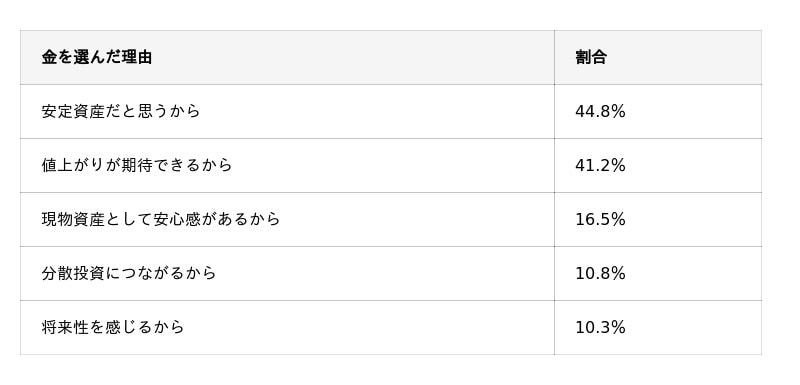「金」を選んだ理由は「安定資産」、「株式」は「値上がり期待」