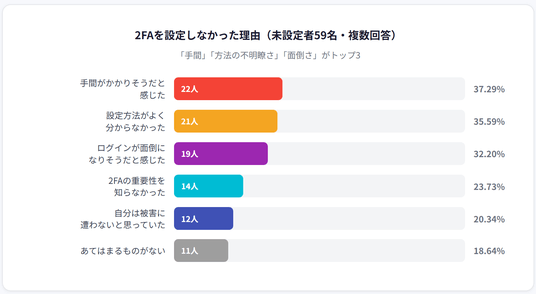 今回の調査結果によると、未設定理由の首位は「手間がかかりそう(約37.3%)」であり、次いで「ログインが面倒(約32.2%)」という利便性への懸念が上位を占めています。