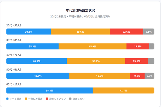これに対し、60代の層では全員が何らかの形で2FAを設定しており、慎重な運用姿勢が際立っています。