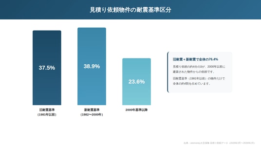 wismoneyに寄せられた見積り依頼データを、建築年をもとに「旧耐震基準(1981年以前)」「新耐震基準(1982~2000年)」「2000年基準以降」の3区分に分類したところ、最も多かったのは新耐震基準の38.9%で、旧耐震基準が37.5%と僅差で続きました。2000年基準以降の物件は23.6%にとどまり、見積り依頼の4分の3以上が2000年以前に建築された物件からの依頼であることが読み取れます。