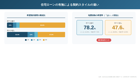 住宅ローンありの利用者は5年契約・地震保険ありの傾向が強く、ローンなしでは1年契約や地震保険なしの割合が高まります。
