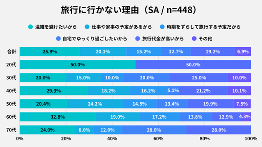 「GWに旅行に行く予定はあるか」 という質問に対し、全体で82.2%が 「いいえ (行かない) 」 と回答。年代別に見ても、最も割合の低い30代で74.1%、20代では100%が 「行かない」 と回答し、大型連休中の旅行を控える傾向が顕著となりました。 「行かない理由」 としては、全ての年代で 「混雑を避けたいから」 が上位を占め、人混みを避けて快適に過ごしたいという意識が強く表れています。