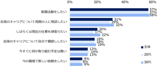 キャリアビジョンが「どちらかというとない」「ない」と回答した方に、今後のキャリアについて考えていることを伺うと、20代、30代いずれも「転職活動をしたい」が最多でした(20代:57%、30代:58%)。