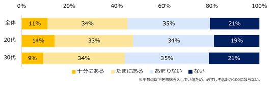 現在の会社で、異動希望申請や社内公募制度など自身のキャリアビジョンを実現するための制度があるかを伺うと、「ある」と回答した方は45%(十分にある:11%、たまにある:34%)と半数以下に留まり、「ない」と回答した方が半数を上回りました(あまりない:35%、ない:21%)。