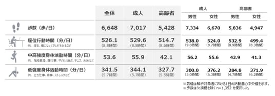 1日あたりの歩数は、成人7,017歩、高齢者5,428歩と、身体活動ガイド2023が定める基準を下回った。1日あたりの座位行動時間は、全体で8.8時間、成人8.8時間、高齢者8.6時間であった。