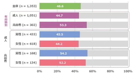 - 成人(20-64歳)の達成率は44.7%、高齢者(65歳以上)は53.3%と、成人は半数を下回った。