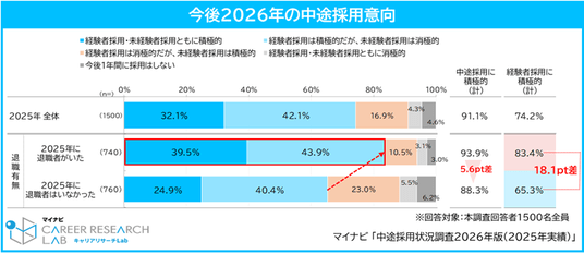 ◆2026年の中途採用は91.1%の企業が積極的な意向。2025年に退職者が発生した企業ほど経験者採用に積極的な姿勢