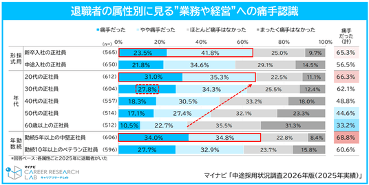 また、退職により業務・経営にマイナスの影響を与えた割合を属性別で見ると、「勤続5年以上の中堅社員(68.8%)」が最多となり、次いで「20代の正社員(66.3%)」、「新卒入社の正社員(65.3%)」となった。