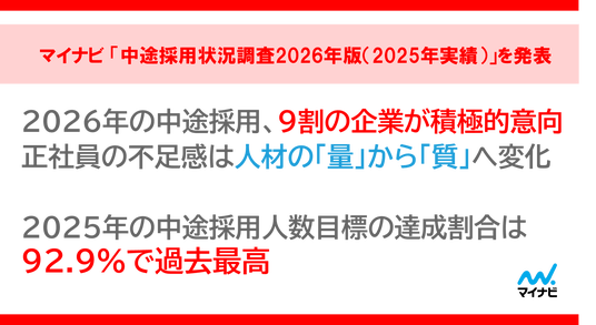 株式会社マイナビ(本社:東京都千代田区、代表取締役 社長執行役員:粟井俊介)は、中途採用業務を担当する企業の人事担当者1,500名に実施した、「中途採用状況調査2026年版(2025年実績)」の結果を発表しました。