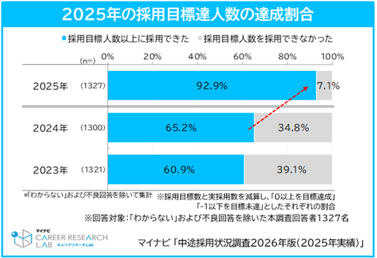 2025年に採用人数の目標を達成した企業は92.9%となり、2024年(65.2%)から27.7pt増と大きく向上した。2023年(60.9%)と比べても、目標達成率の向上は顕著といえる。