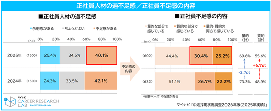 2026年の中途採用、9割の企業が積極的な意向。正社員の不足感は人材の「量」から「質」へ変化している傾向。2025年の中途採用人数目標の達成割合は92.9%で過去最高