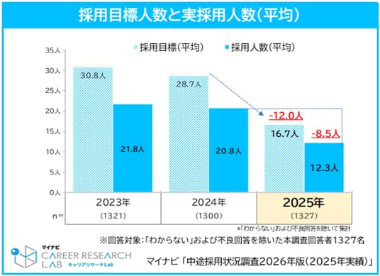 実際の平均採用人数を見ても、2025年は12.3人で、2023年の21.8人、2024年の20.8人から減少している。