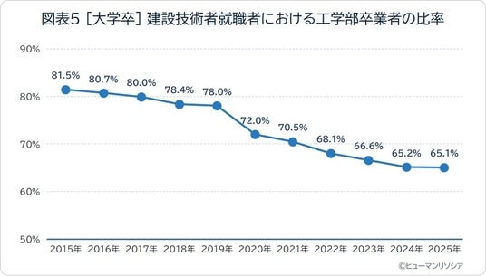 また女性の建設技術者就職者数は増加傾向にあり、大学卒の就職者に占める女性比率は2025年時点で24.8%と、就職者の約4分の1を女性が占めています。大学の学部別就職者では、土木建築工学などを含む工学部出身者が占める割合が継続して低下しており、2025年には65.1%となりました。