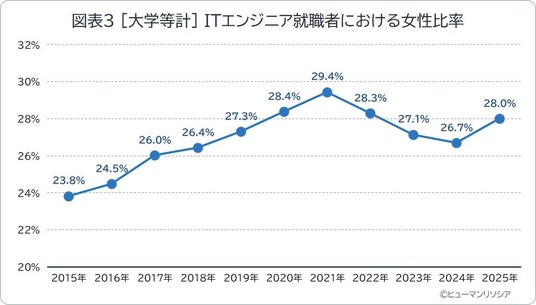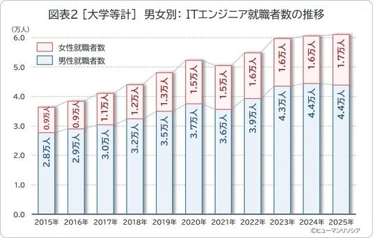 総合人材サービス会社で、海外ITエンジニア派遣サービスを展開するヒューマンリソシア株式会社(本社:東京都新宿区、代表取締役:高橋 哲雄、以下「当社」)は、DXの進展やAIの活用拡大を背景に人材需要が高まっているITエンジニアの新卒就職動向について、最新データをもとに集計・分析しました。調査の結果、大学等新卒のITエンジニア就職者数は、4年連続で増加するも、増加幅は縮小傾向であることがわかりました。また、高度な専門知識をもつ修士・博士修了の就職者が減少に転じる一方、理系(理学・工学)以外が増加傾向で、ITエンジニアへの新卒就職者の構成は多様化しています。IT技術が高度化する中、採用後の企業での人材育成がより重要となると考えられます。