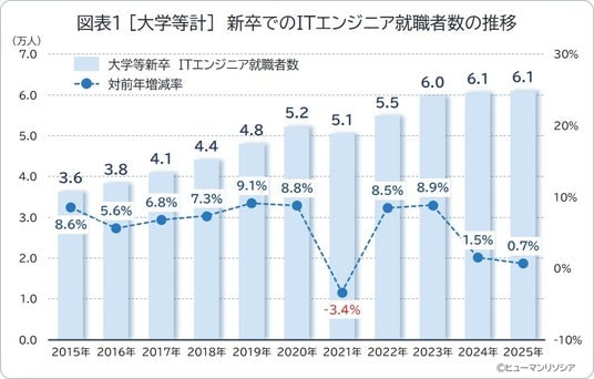 大学等の高等教育機関(大学院、大学、短大、高専、専修学校)を2025年3月に卒業し、新卒でITエンジニアとして就職した人数は、合計で6.1万人となりました。前年より0.7%増え、4年連続で増加しているものの、伸び率は鈍化傾向となりました。