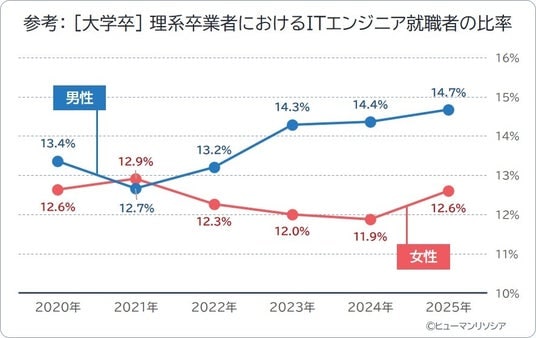 なお、参考までに、理系卒業者では、ITエンジニア職を選ぶ学生が増えているのか、その推移をみると、男性は緩やかに上昇していますが、女性は2025年は上昇しているものの、低下基調にあることがわかります。IT人材不足への解決策の一つとして、女性活躍が期待されていますが、若者や女性にITエンジニア職が選ばれるよう、働き方などの待遇改善を含めた職業としての魅力を向上させる必要性が高まっています。