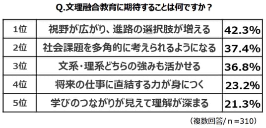 保護者に対し、文系・理系のどちらの要素も併せ持ち横断的に学んでいく“文理融合教育”について聞きました。まず、イメージについては、1位「文系・理系どちらの強みも活かせそうで魅力的」、2位「視野が広がり、発想力が伸びそう」、3位「将来の仕事や社会で役立ちそう」と、いずれもポジティブな項目が上位に挙がりました。また、期待することを聞くと、1位「視野が広がり、進路の選択肢が増える」、2位「社会課題を多角的に考えられるようになる」、3位「文系・理系どちらの強みも活かせる」という結果に。ピンポイントのスキル装着などではなく、どちらの良さも取り入れながら視野を広げることを総じて期待しているようです。