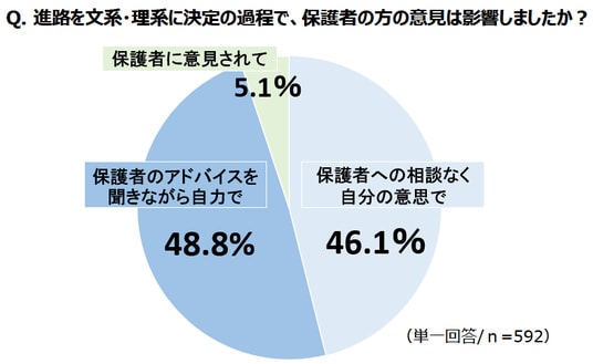 文理選択のプロセスについて「保護者のアドバイスを聞きながら自力で決める」生徒が48.8%と、「保護者への相談なく自分の意思で」の46.1%を超えていました。こうした調査結果からも、高校生の進路検討全般に対する保護者の関与や影響力は高まっているようです。
