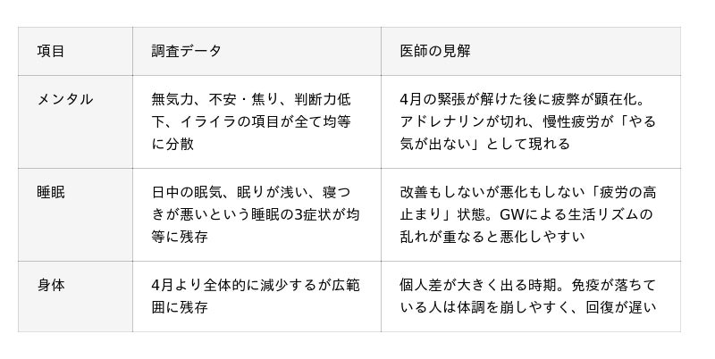 4月に見られた「特定の症状の突出」がなく、満遍なく不調が残る状態です。メンタルでは「無気力」が最多となり、4月の「不安・焦り」から質的に変化しています。