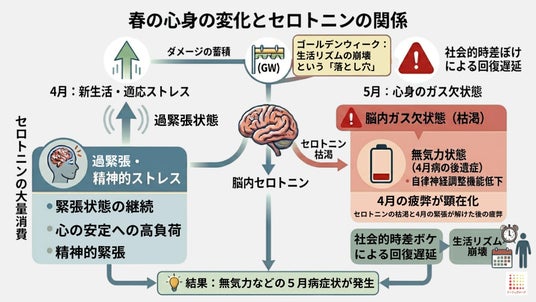 4月の過度な緊張や環境変化に対応するために、心を安定させる脳内物質「セロトニン」が大量に消費され、5月を迎える頃にはいわば「脳の貯金」が底をついたガス欠状態に陥ります。 この状態でゴールデンウィークの連休に入り、張り詰めていた糸(交感神経)がプツンと切れると、自律神経の調整がうまくいかず、強い無気力やだるさといった「5月病」の症状が引き起こされるのです。