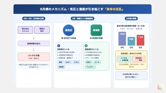 4月・5月・6月の不調は、それぞれ「自律神経の過負荷(4月)」「慢性疲労の顕在化(5月)」「気象病(6月)」という、まったく異なるメカニズムで起きています。