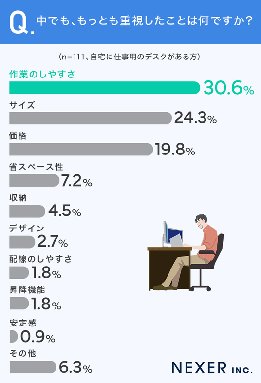 続いて、仕事用のデスクを選ぶにあたって、もっとも重視したことをひとつ選んでもらいました。