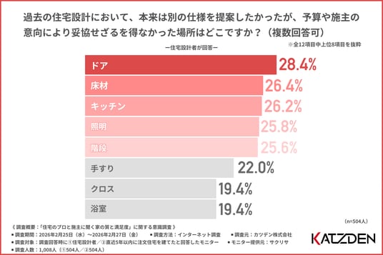 「過去の住宅設計において、本来は別の仕様を提案したかったが、予算や施主の意向により妥協せざるを得なかった場所」について尋ねたところ、『ドア(28.4%)』『床材(26.4%)』『キッチン(26.2%)』が挙がり、さらに『階段(25.6%)』も僅差で続く結果となりました。
