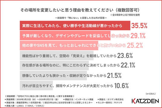 続いて、前問で『特にない』以外を回答した方に、「その場所を変更したいと思う理由」について尋ねたところ、『実際に生活してみたら、使い勝手や生活動線が悪かったから(35.5%)』と回答した方が最も多く、『予算が厳しくなり、デザインやグレードを妥協してしまったから(29.1%)』『他の家やSNSを見て、もっとおしゃれにできると気づいたから(25.2%)』と続きました。