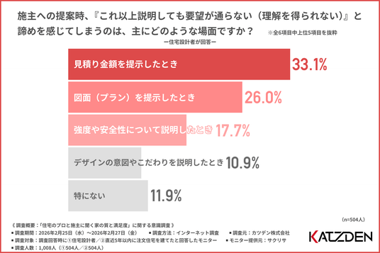 「施主への提案時、『これ以上説明しても要望が通らない(理解を得られない)』と諦めを感じてしまう場面」について尋ねたところ、『見積り金額を提示したとき(33.1%)』と回答した方が最も多く、『図面(プラン)を提示したとき(26.0%)』『強度や安全性について説明したとき(17.7%)』と続きました。