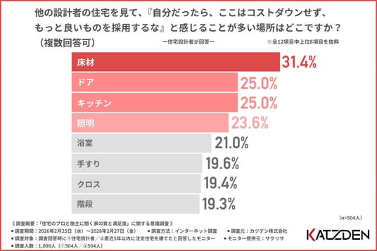 「他の住宅設計者の住宅を見て、『自分だったら、ここはコストダウンせず、もっと良いものを採用するな』と感じることが多い場所」について尋ねたところ、『床材(31.4%)』と回答した方が最も多く、『ドア(25.0%)』『キッチン(25.0%)』『照明(23.6%)』が上位に挙がりました。