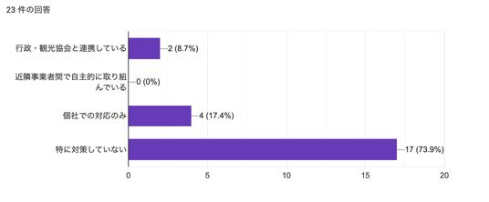 オーバーツーリズムを実感しながらも、組織的・地域連携による対策が進んでいない実態が明らかになりました。個社対応にとどまる現状は、今後の課題として業界全体で共有すべき問題です。
