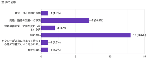 一方で「東京では感じない」「他の場所ではまったく感じない」という声もあり、オーバーツーリズムの影響は観光集中地に局所化されていることがわかります。