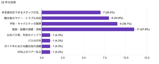 文化的マナーのギャップや言語の壁も一定数見られ、オーバーツーリズムが単なる混雑問題にとどまらず、サービス品質や顧客体験にも影響を及ぼしていることがわかります。