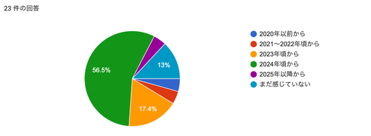約74%がコロナ明け以降(2023~2024年)に実感し始めたと回答