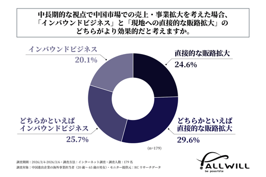 中国越境ビジネス支援事業を展開する株式会社オールウィル(本社:東京都港区、代表取締役:陳 亮・齋藤 勉)は、中国進出企業の海外事業担当者(20歳~65歳の男女)を対象に「日本企業の中国市場進出に関する調査」を実施しました。この調査から、中国進出企業の海外事業担当者が抱く、中国からの「インバウンド消費」に依存するビジネスモデルへの意識、また、中長期的な視点での直接的な販路拡大の有効性、さらには販路拡大を推進する上での障壁と対策などが明らかになりました。