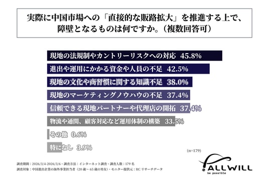 続いて、中国進出企業の海外事業担当者を対象に「実際に中国市場への『直接的な販路拡大』を推進する上で、障壁となるものは何か」を尋ねる設問への回答では、1位が「現地の法規制やカントリーリスクへの対応」で45.8%、2位が「進出や運用にかかる資金や人員の不足」で42.5%、3位が「現地の文化や商習慣に関する知識不足」で38.0%という結果になりました。この結果から、実際に中国市場への「直接的な販路拡大」を推進する上での主な障壁は「現地の法規制やカントリーリスクへの対応」や「進出や運用にかかる資金や人員の不足」であることが判明しました。