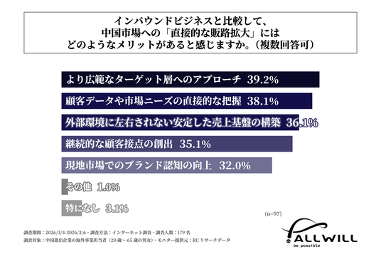 次に、直接的な販路拡大のほうがより効果的だと考えている中国進出企業の海外事業担当者を対象に「インバウンドビジネスと比較して、中国市場への直接的な販路拡大にはどのようなメリットがあると感じるか」を尋ねる設問への回答では、1位が「より広範なターゲット層へのアプローチ」で39.2%、2位が「顧客データや市場ニーズの直接的な把握」で38.1%、3位が「外部環境に左右されない安定した売上基盤の構築」で36.1%という結果になりました。4位以降も回答比率30%を超える回答が複数並ぶ結果となり、この結果から、インバウンドビジネスと比較した、中国市場への直接的な販路拡大のメリットは、多岐にわたることが明らかになりました。