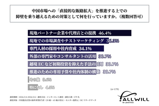・中国市場への「直接的な販路拡大」を推進する上での障壁を乗り越えるための対策のトップ3は、1位「現地パートナー企業や代理店との提携」、2位「現地での市場調査やテストマーケティング」、3位「専門人材の採用や社内育成」