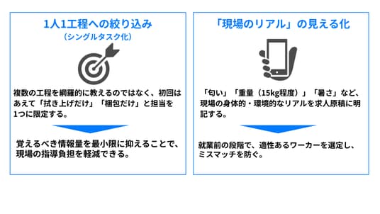 複数の工程を習得させるのではなく、単一のタスクに限定して依頼することで、指導時間を短縮する事例が見られました。