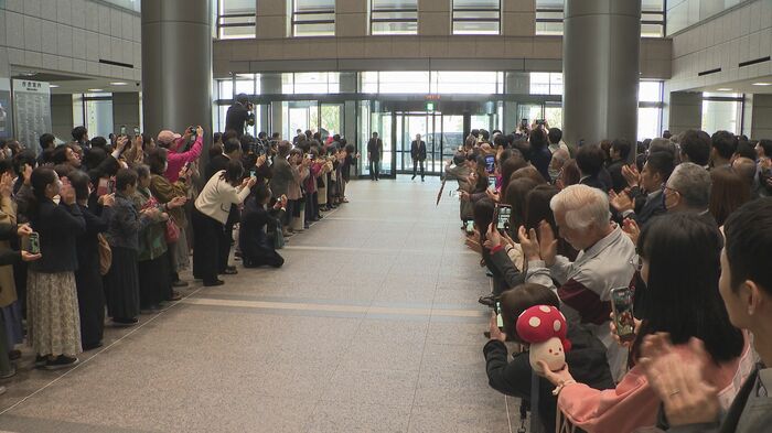 午前9時半すぎ、石川県庁の玄関前は独特の高揚感に包まれていた。職員や県民が今か今かと待ち構える中、山野新知事が姿を現すと、会場に大きな拍手が広がった。
