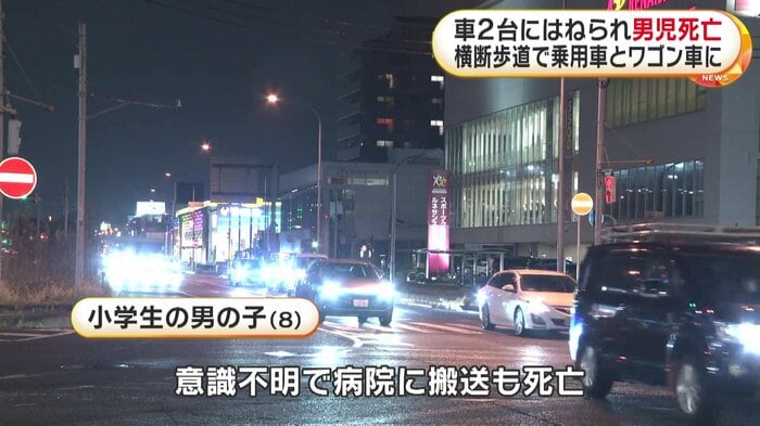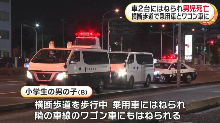 警察によりますと、小学生の男の子(8)が信号がある横断歩道を渡っていたところ乗用車にはねられ、さらに、隣の車線を直進していたワゴン車にもはねられた。