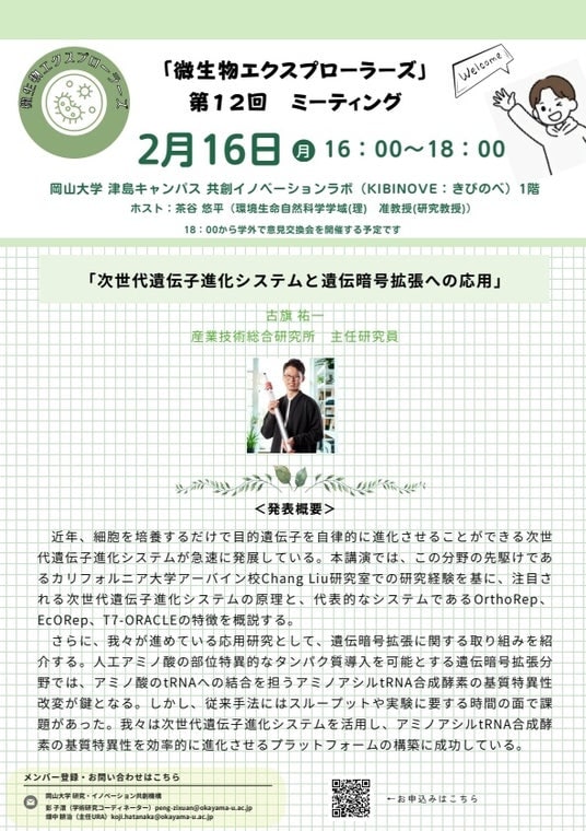 国立大学法人岡山大学(本部:岡山市北区、学長:那須保友)は2026年2月16日、異分野融合と研究拠点形成を目指して発足した研究グループ「微生物エクスプローラーズ」(注)の第12回ミーティングを、津島キャンパスの共創イノベーションラボ(KIBINOVE:きびのべ)にて開催しました。