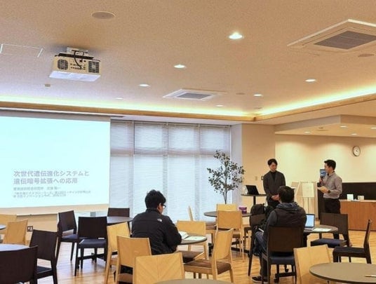 ミーティングは、学術研究院環境生命自然科学学域(理)の茶谷悠平研究教授による開会あいさつで幕を開けました。続いて、産業技術総合研究所の古旗祐一主任研究員が「次世代遺伝子進化システムと遺伝暗号拡張への応用」と題して講演しました。