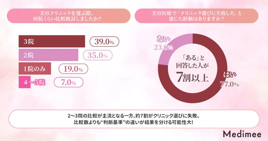 【美容クリニックを選ぶ際、何院くらい比較検討しましたか?また、美容医療で「クリニック選びに失敗した」と感じた経験はありますか?】